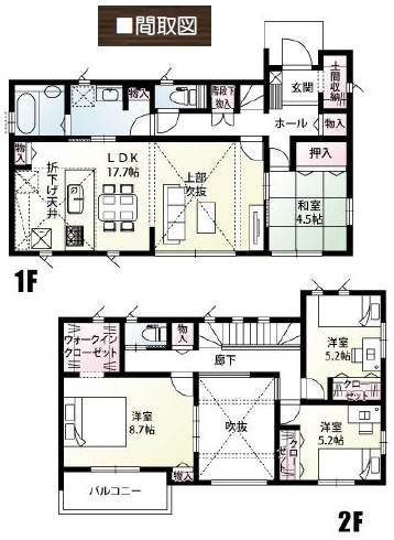 | 間取詳細 | 1F:和4.5、LDK17.7、2F:洋8.7、5.2、5.2 | 取引態様 | 仲介 |
