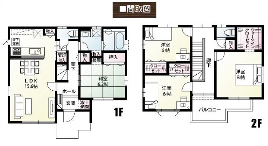 | 間取詳細 | 1F:和6.2、LDK15.6、2F:洋6、6、8 |