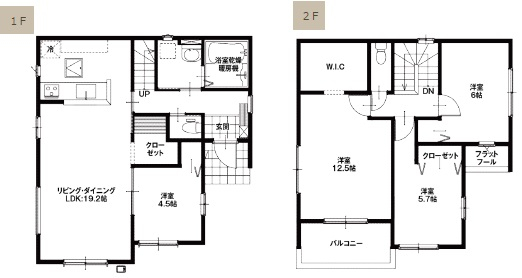 | 間取詳細 | 1F:洋4.5、LDK19.2、2F:洋6、5.7、12.5 |