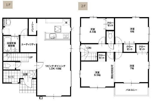 | 間取詳細 | 1F:LDK18、2F:洋4.5、6、6.5、7 |