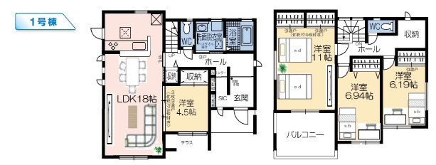 | 間取詳細 | 1F:洋4.5、LDK18、2F:洋11、6.94、6.19 |