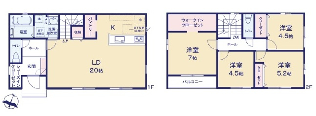 | 間取詳細 | 1F:LDK、2F:洋7、4.5、4.5、5.2 |