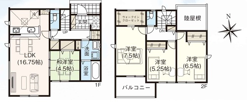 | 間取詳細 | 1F:和洋室4.5、LDK16.75、2F:洋7.5、5.25、6.5 |