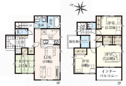 | 間取詳細 | 1F:和洋室4.5、LDK16、2F:洋5.25、6、7.2 |